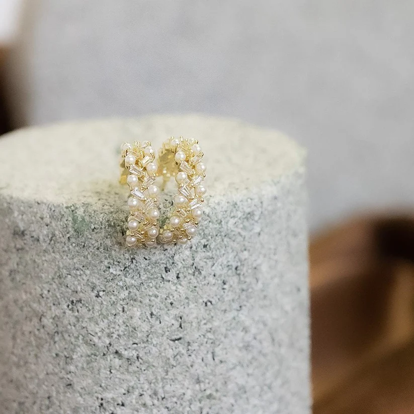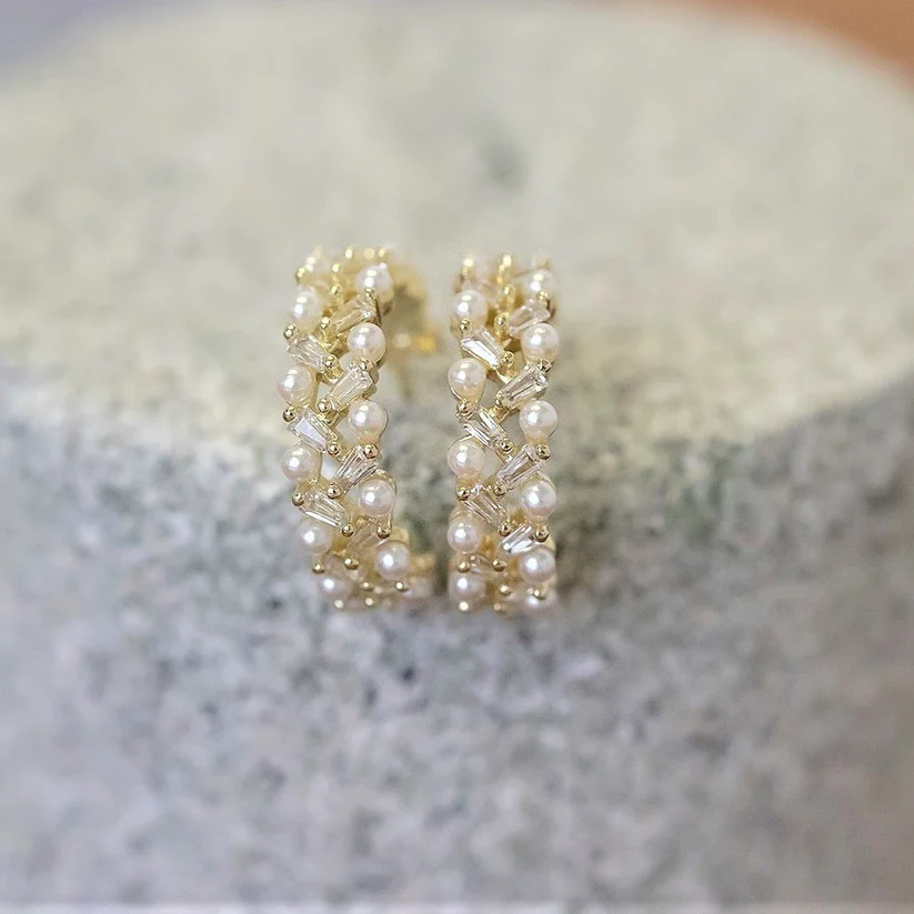 Dress up your lobes with these mini hoops. These everyday hoops are lined with a row of glass crystals and pearls. The perfect transitional piece to take you from day to night in style!